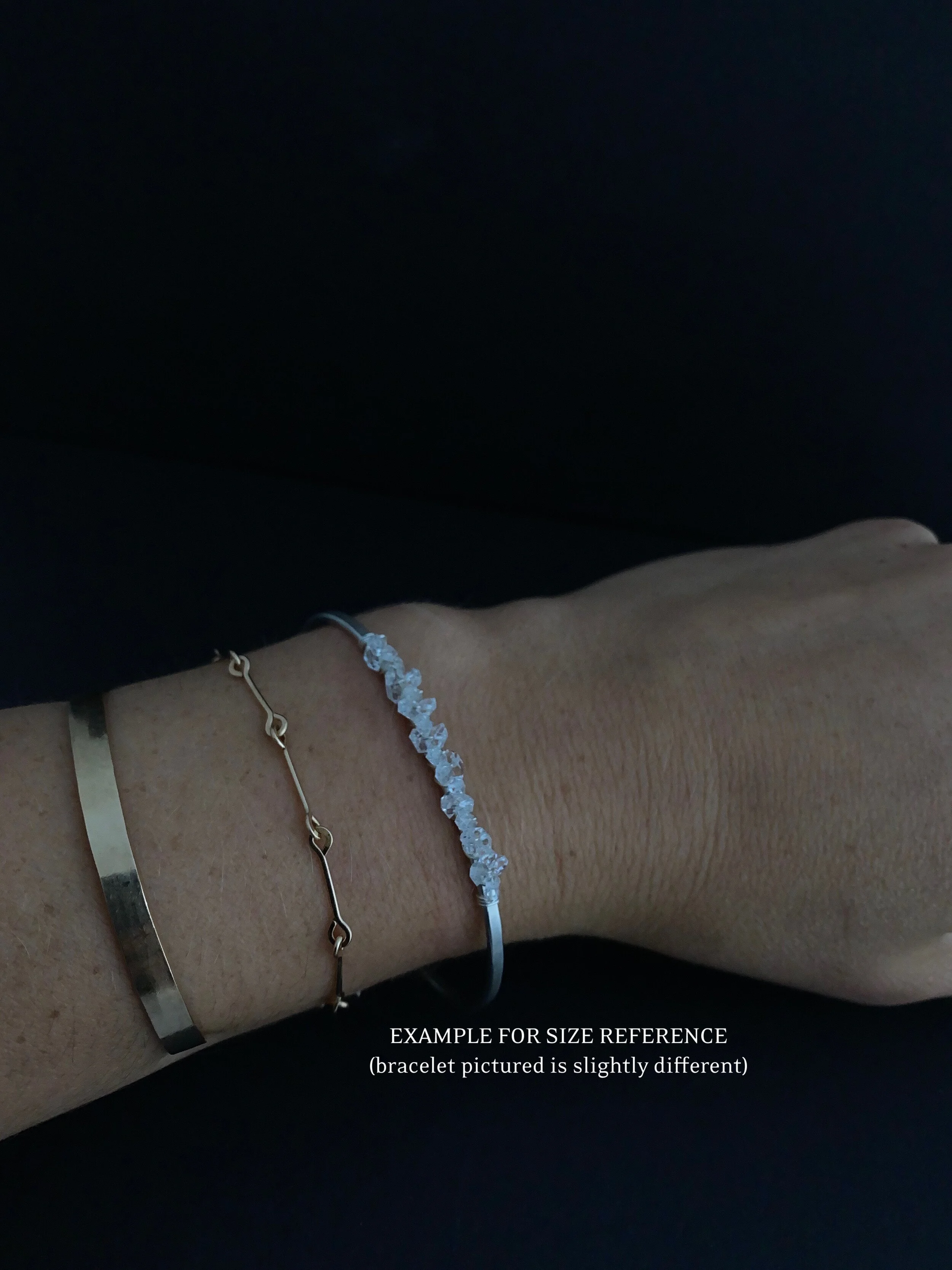 strong hand forged cuff wrapped with herkimer “diamonds” (quartz).